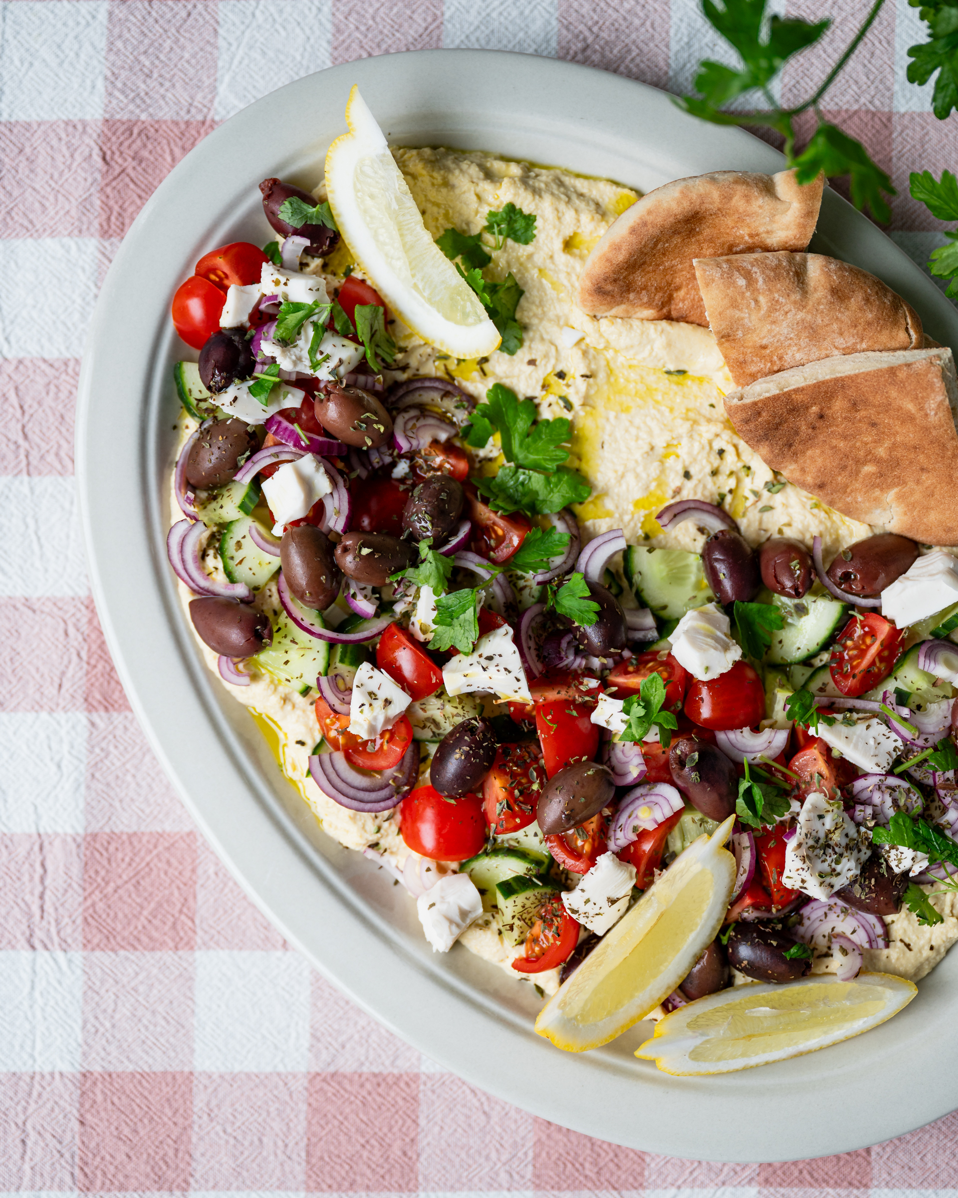 Isolle lautaselle ladotaan Baban taivaallista hummusta (tiesitkö että hummusten isoin makuero tulee kikherneen ja öljyn suhteesta? Jotkut merkit käyttävät paaaljon vähemmän kikherneitä ja enemmän öljyä mikä ei varsinaisesti paranna makua), päälle ladotaan kreikkalaisesta salaatista tuttuja asioita: kurkkua, tomaattia, punasipulia, fetaa, kalamata oliiveja, oreganoa ja minttua sekä lehtipersiljaa. Kylkeen voi paahtaa pitaleipää.